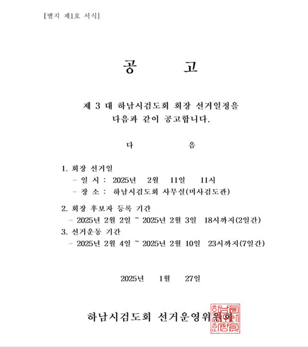 하남시 검도협회 회장 선거 일정 공고 페이지 정보 작성자 최고관리자 조회 387회 작성일 25-01-31 14:04 목록 본문 이전글하남시 족구협회 회장 당선인공고 25.02.03 다음글하남시축구협회 회장 선거일정 공고 25.01.31