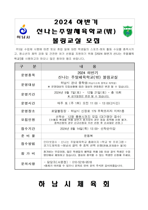 2024 하반기 신나는 주말체육학교(밖) 볼링,스쿼시교실 페이지 정보 작성자 최고관리자 조회 939회 작성일 24-08-02 10:18 목록 본문 이전글하남시 생활체육 스쿼시교실 모집공고 25.10.13 다음글2024 생활체육 어르신배드민턴교실 참가자 모집 24.06.17