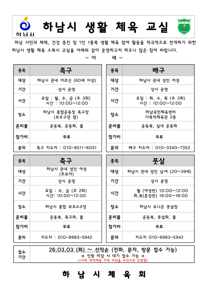 2026년도 하남시 생활체육교실 모집 페이지 정보 작성자 하남시체육회 조회 32회 작성일 26-02-27 17:32 목록 본문 . 다음글하남시 생활체육 스쿼시교실 모집공고 25.10.13