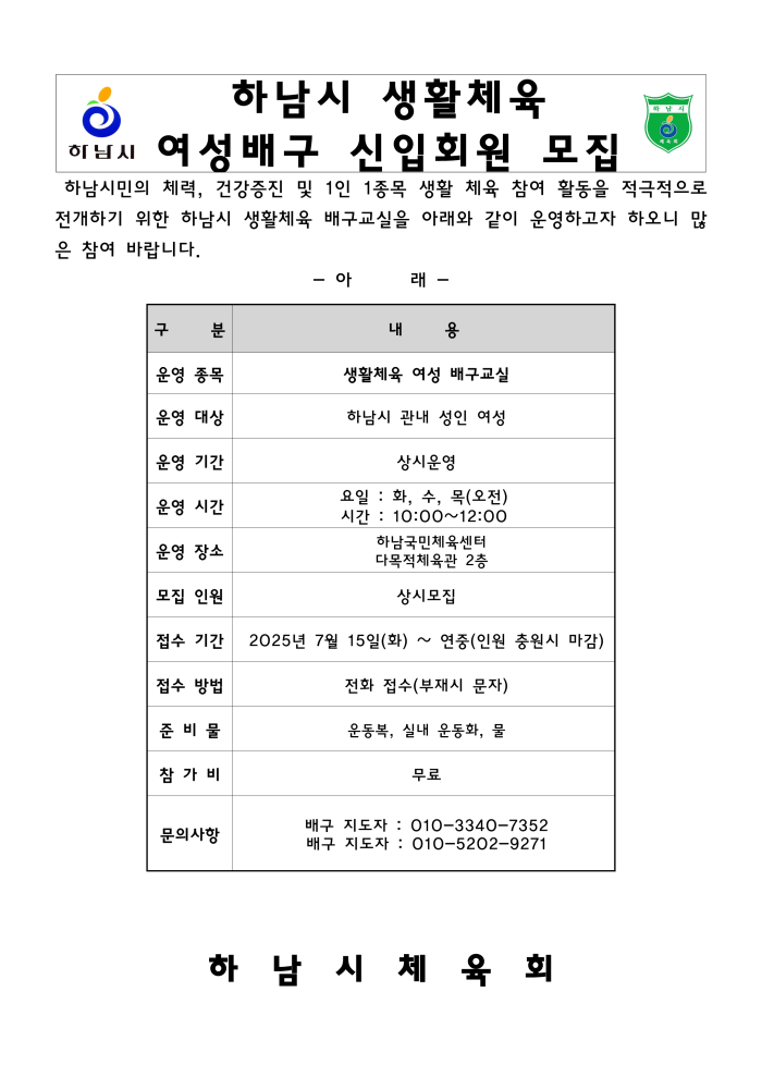 2025년 생활체육교실 여성배구 페이지 정보 작성자 하남시체육회 조회 313회 작성일 25-07-08 15:19 목록 본문 이전글2025년 하남 리프레시 배구교실 25.07.30 다음글2025 생활체육교실 시니어탁구 (다목적체육관 덕풍동) 25.06.13