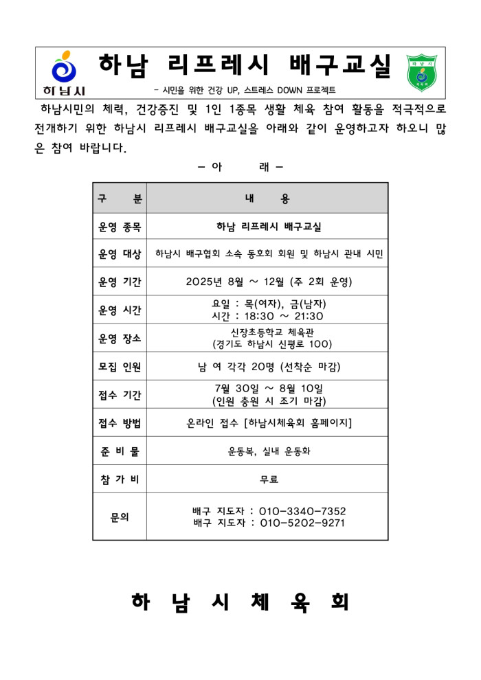 2025년 하남 리프레시 배구교실 페이지 정보 작성자 하남시체육회 조회 334회 작성일 25-07-30 09:59 목록 본문 이전글2025 하반기 신나는주말체육학교(밖) 볼링 ,스쿼시 교실 모집 25.08.07 다음글2025년 생활체육교실 여성배구 25.07.08
