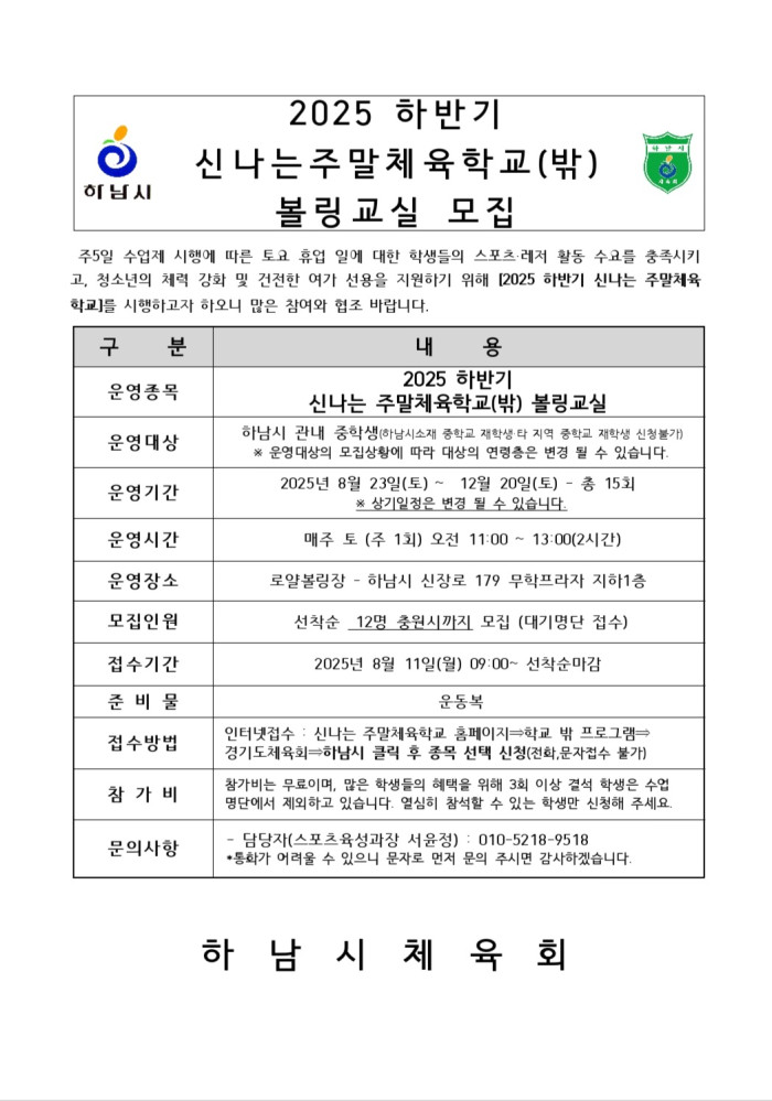 2025 하반기 신나는주말체육학교(밖) 볼링 ,스쿼시 교실 모집 페이지 정보 작성자 하남시체육회 조회 249회 작성일 25-08-07 16:15 목록 본문 . 이전글2025 G-스포츠 25.09.16 다음글2025년 하남 리프레시 배구교실 25.07.30