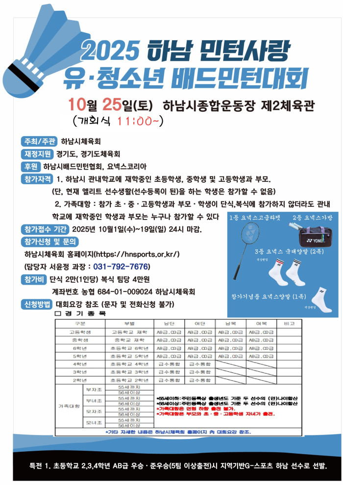(경기체육진흥공모사업)2025 하남민턴사랑 유.청소년 배드민턴대회 페이지 정보 작성자 하남시체육회 조회 279회 작성일 25-10-01 09:30 목록 본문 . 이전글하남시 생활체육 스쿼시 교실 모집공고 25.10.13 다음글(경기체육진흥공모)족구라이프 25.09.24